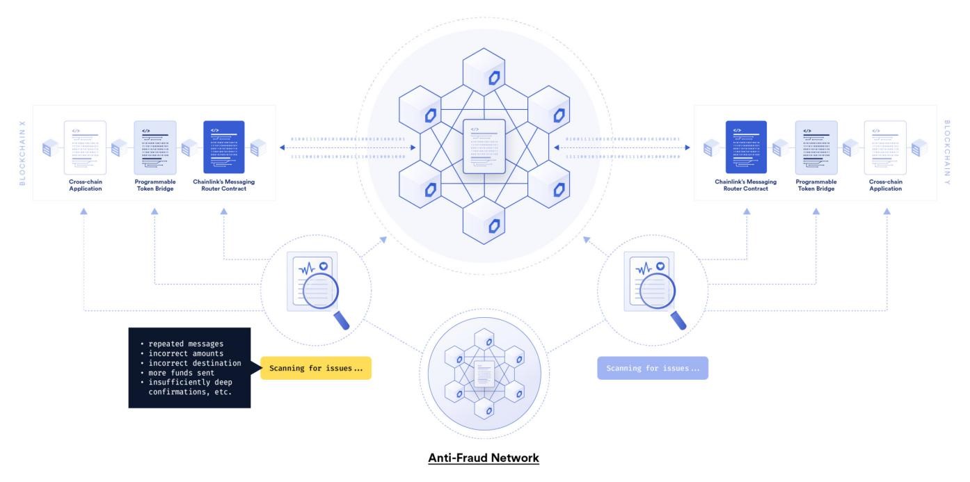 CCIP不仅拥有高质量的代码库,还计划采用名为“防欺诈网络”(Anti-Fraud Network)的创新风控系统来进一步保障安全。防欺诈网络由多个去中心化的预言机网络组成,这些预言机网络又由多个独立的节点委员会构成,这些节点不参与CCIP跨链桥的运行,而是专门负责监控CCIP服务中可能出现的恶意攻击行为或区块重组等网络突发状况。这一额外的验证层有权紧急关闭跨链桥,暂停数据和通证传输,以保护跨链智能合约和用户免受黑天鹅事件的影响。