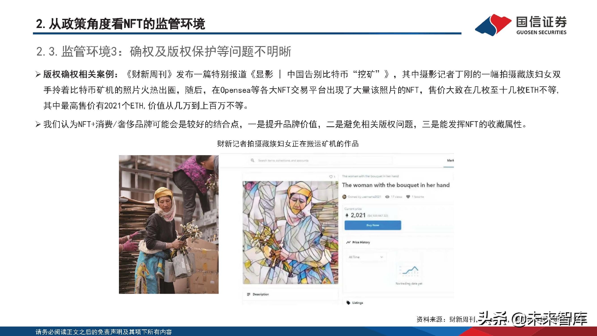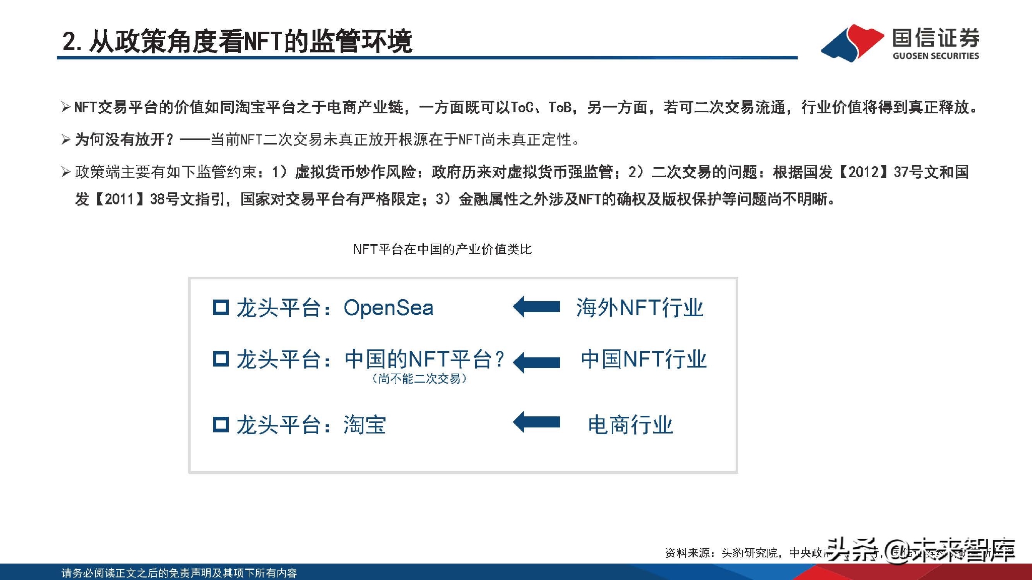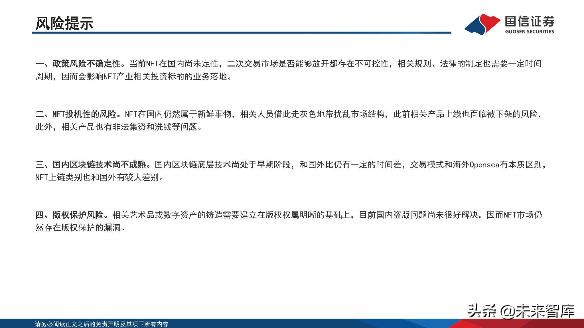 2)NFT尚未在国内真正定性,收藏价值大于金融属性,无币化的版权确权探索是当前正在进行的清晰方向。