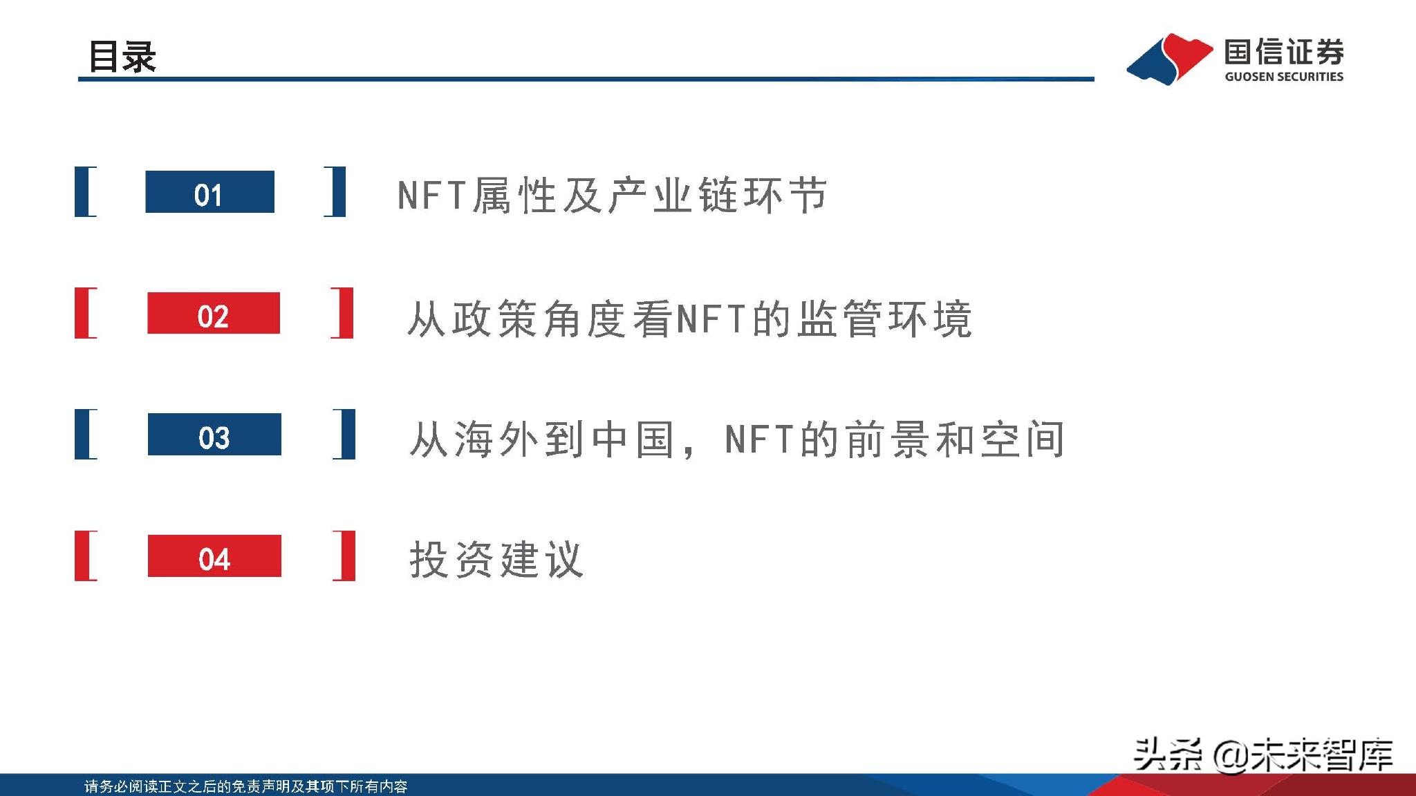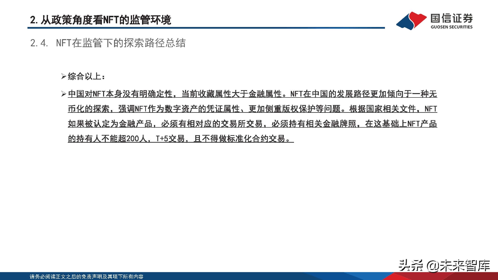 综合以上:?中国对NFT本身没有明确定性,当前收藏属性大于金融属性。NFT在中国的发展路径更加倾向于一种无 币化的探索,强调NFT作为数字资产的凭证属性、更加侧重版权保护等问题。根据国家相关文件,NFT 如果被认定为金融产品,必须有相对应的交易所交易,必须持有相关金融牌照,在这基础上NFT产品 的持有人不能超200人,T+5交易,且不得做标准化合约交易。