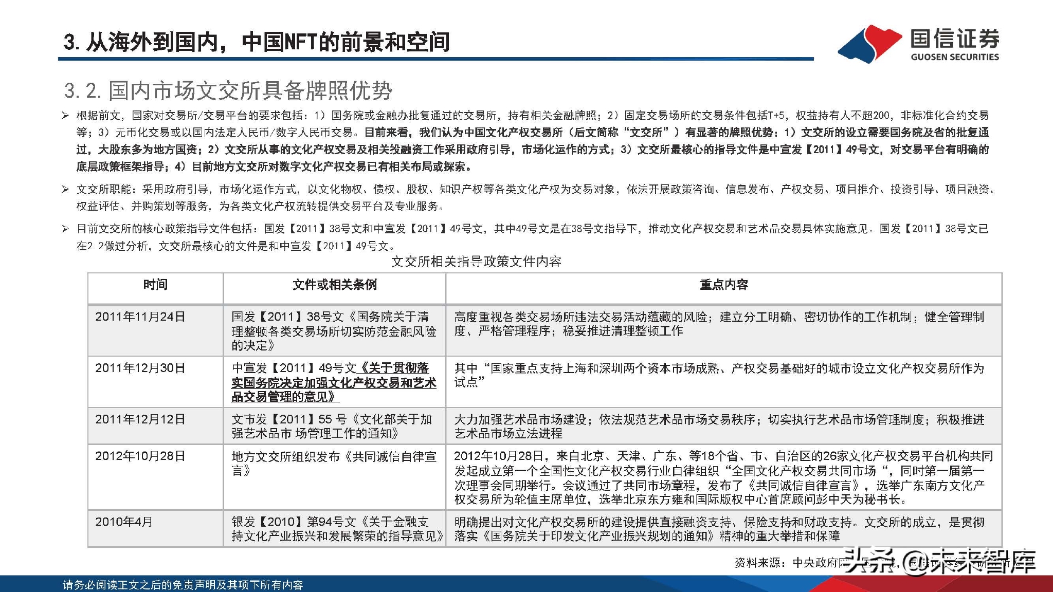 根据前文,国家对交易所/交易平台的要求包括:1)国务院或金融办批复通过的交易所,持有相关金融牌照;2)固定交易场所的交易条件包括T+5,权益持有人不超200,非标准化合约交易 等;3)无币化交易或以国内法定人民币/数字人民币交易。目前来看,我们认为中国文化产权交易所(后文简称“文交所”)有显著的牌照优势:1)文交所的设立需要国务院及省的批复通 过,大股东多为地方国资;2)文交所从事的文化产权交易及相关投融资工作采用政府引导,市场化运作的方式;3)文交所最核心的指导文件是中宣发【2011】49号文,对交易平台有明确的 底层政策框架指导;4)目前地方文交所对数字文化产权交易已有相关布局或探索。