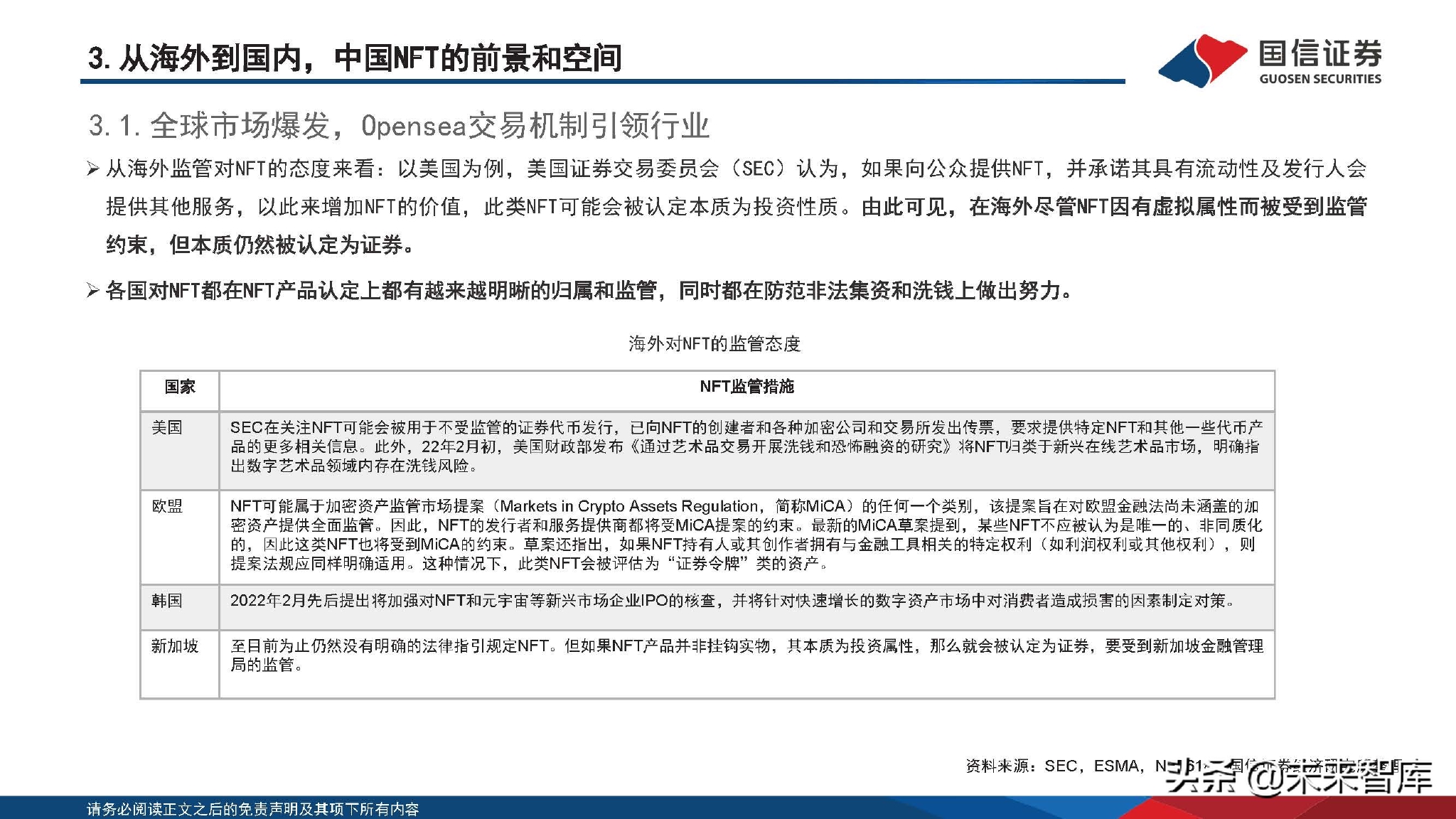 从海外监管对NFT的态度来看:以美国为例,美国证券交易委员会(SEC)认为,如果向公众提供NFT,并承诺其具有流动性及发行人会 提供其他服务,以此来增加NFT的价值,此类NFT可能会被认定本质为投资性质。由此可见,在海外尽管NFT因有虚拟属性而被受到监管 约束,但本质仍然被认定为证券。 各国对NFT都在NFT产品认定上都有越来越明晰的归属和监管,同时都在防范非法集资和洗钱上做出努力。