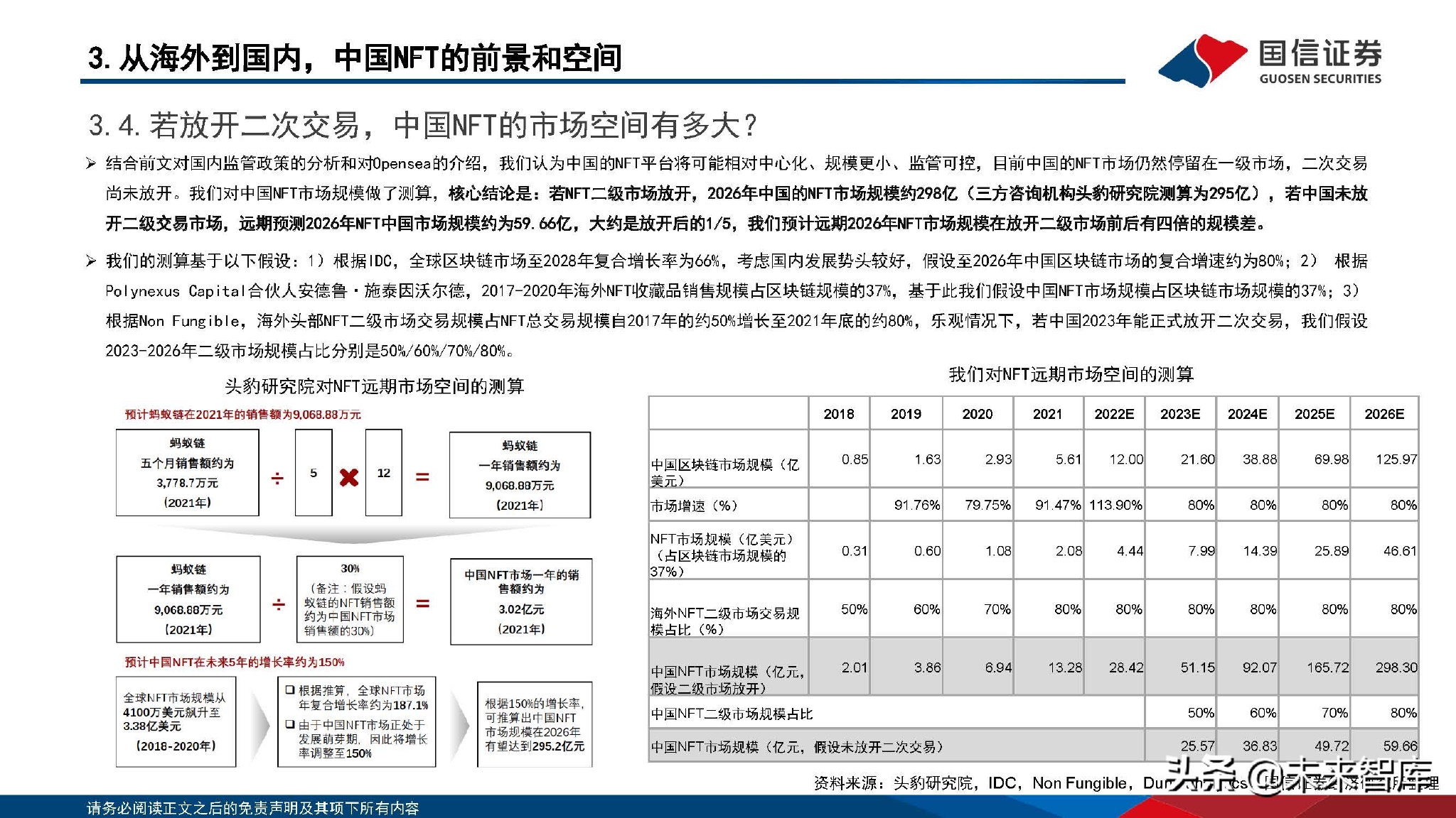 NFT对于国内购买者而言,到底购买了什么?1)部分平台赋予购买者获得数字艺术品的使用权、复制权等,如古董艺术品的NFT购买者可以获取其元数据,利于古董艺术品的 流转;2)对艺术家和创作者的心理认同,获得粉丝唯一认证编号或专属铭牌;3)若国内二次交易市场打开,国内NFT市场才有望真正打开。(报告来源:未来智库)