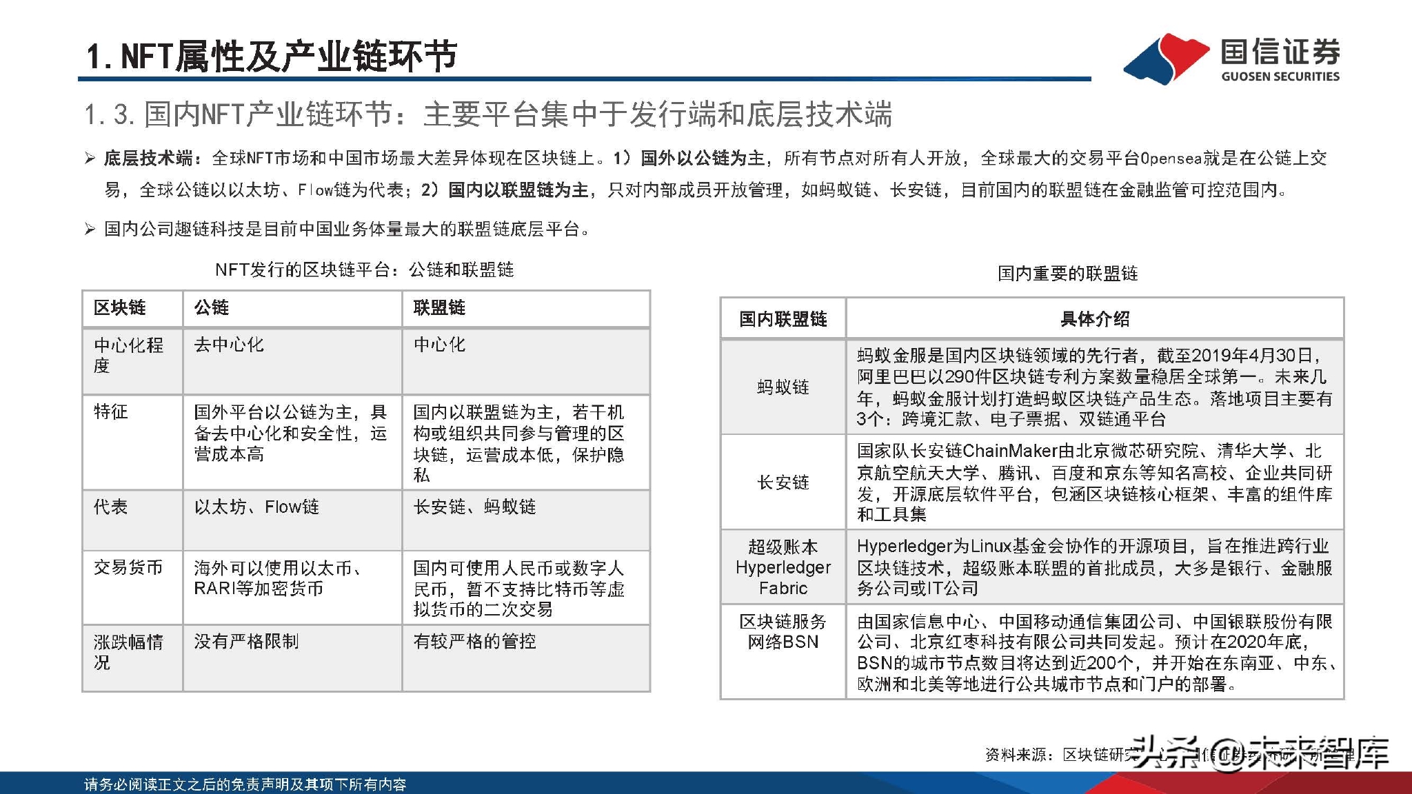 底层技术端:全球NFT市场和中国市场最大差异体现在区块链上。1)国外以公链为主,所有节点对所有人开放,全球最大的交易平台Opensea就是在公链上交 易,全球公链以以太坊、Flow链为代表;2)国内以联盟链为主,只对内部成员开放管理,如蚂蚁链、长安链,目前国内的联盟链在金融监管可控范围内。 国内公司趣链科技是目前中国业务体量最大的联盟链底层平台。