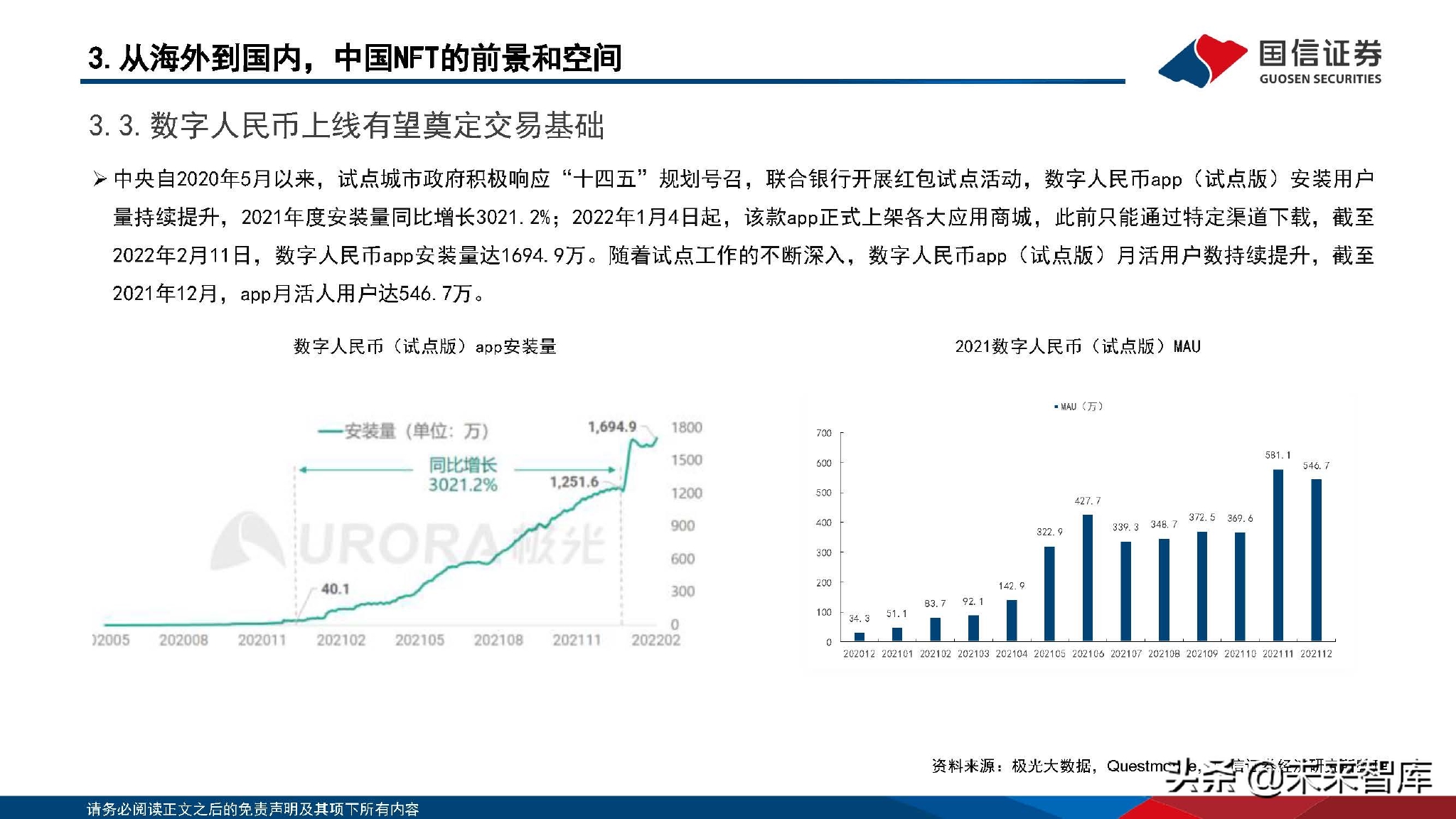 2022年1月4日数字人民币正式上线,我们认为数字人民币奠定了数字藏品的流通交易基础。数字人民币以数字形式存在,依靠国家信用,具有高法律地位以及 交易安全性,其自身具有价值,并支持双离线支付、交易可控匿名等特点,可降低银行现金管理成本,并实现对大额非法资金流动的监管。一方面数字人民币 可以逐渐确保NFT交易的资金安全,防止洗钱和非法集资;另一方面,同质化数字人民币相关监管政策的出台将给予非同质化的NFT行业相关政策指引。结合前 文文交所相关政策解读,我们认为相关数字藏品二级交易市场监管政策的出台有望逐步搭建全新的数字经济新体系。(报告来源:未来智库)