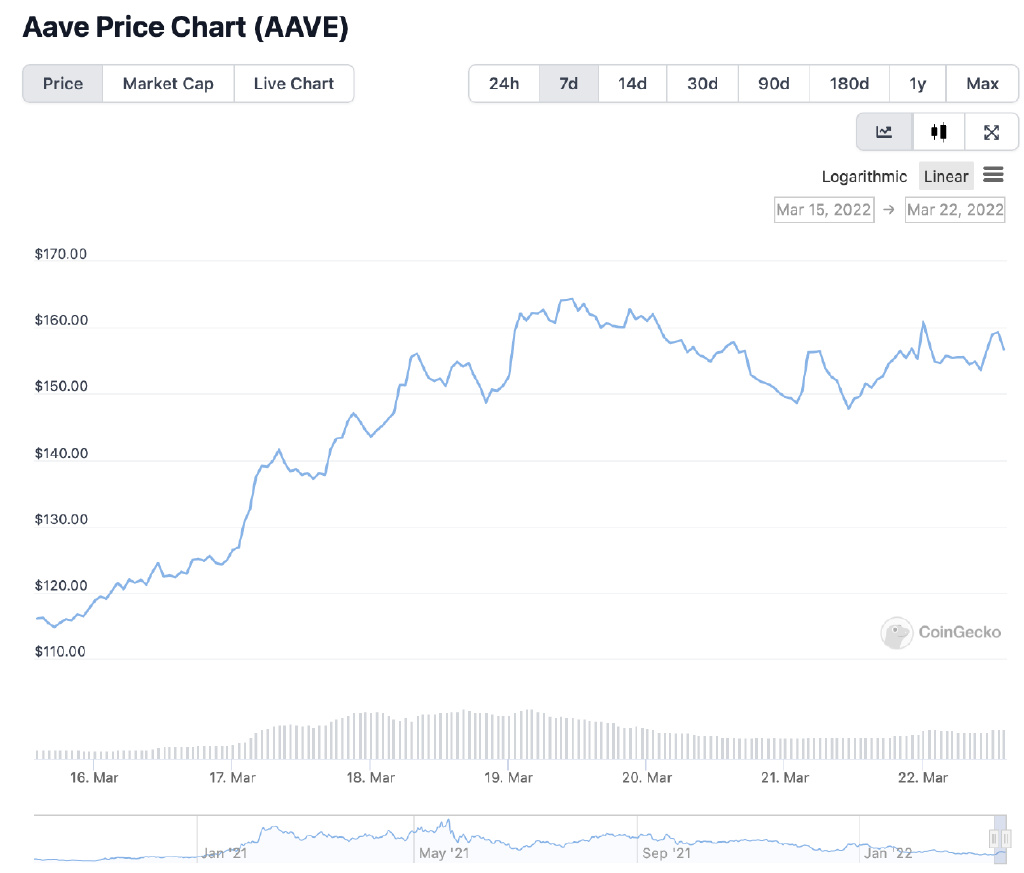 此外,Aave代币价格也得到了明显的上升,据Coingecko数据显示,AAVE在一周内价格上涨了33.4%。