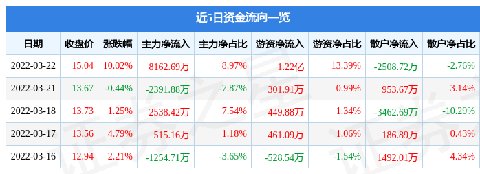 资金流向数据方面,当日主力资金净流入8162.69万元,游资资金净流入1.22亿元,散户资金净流出2508.72万元。近5日资金流向一览见下表:
