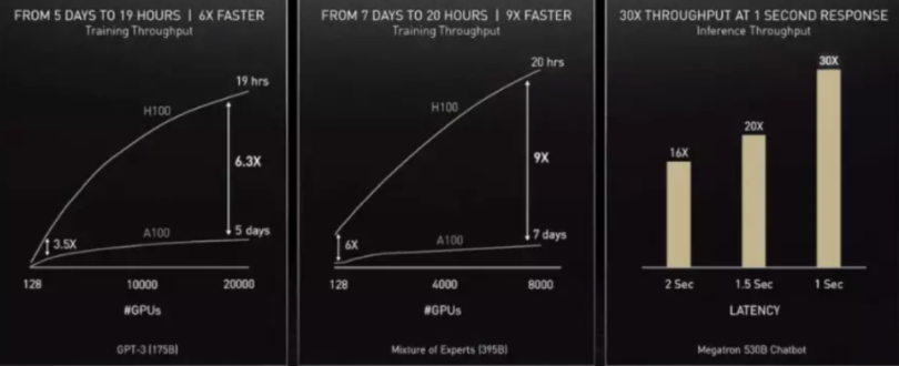 在英伟达给出的测试数据中,训练一个拥有1750亿参数的GPT-3模型,时间将由原来的一周降低到仅需19小时,而一个拥有3950亿参数的Transforme模型也仅需21小时就可以完成训练,效率提升近9倍。