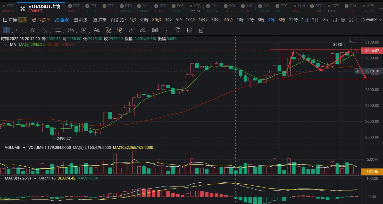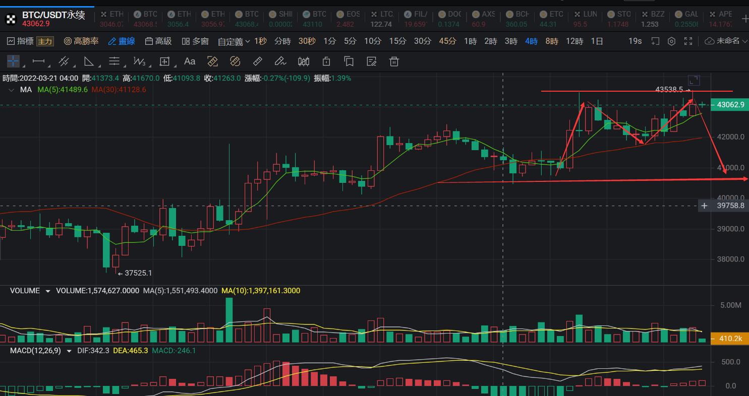 就日线上面来说,比特币昨日的阳线走出并没有刷新高点,反而是今天行情走出了一个向上的试探动作,但是到目前为止没有奏效,也就是说上涨的力度不够,可视为多头无力突破并站稳压力位,短期内日线级别的运行空间不大,还是存在变盘的风险。四小时线看来,上方初步走出了一个M顶的形态,今天日内若是不能再次刷新高点并站稳前期高点上方的话,那么顶部成型,后市开启新一轮的下跌。另一方面,行情虽然高位走纠结但是不排除晚间行情进一步上涨拉升,做出突破的可能,突破的话,那么就确认了多头方向短期内还会延续,也会成为多空方向选择的最后一根稻草,因此需要注意防范。就目前的走势来说,老刘还是更倾向于行情没有能力刷新新高,但是考虑到风险的问题,交易上面做空的话也还是尽量找日内运行的高点,去尝试摸顶,也就是能尽量等到行情反弹上去触及43500一线去开始布局空单,利用非常小的止损去把控风险。毕竟高位纠结了多天,如果变盘就在今天的话,行情最终选择了空头方向,那么追涨就是最高位的多单,风险较大,按照风险收益比来说,也是做空更加合适。这些天上方已经初步走出了一个箱体运行的区间,而箱体运行当中,向上刺破没有延续的话,就存在技术面上面经常说到的虚破压力反看空。日内思路,行情反弹43000-43500区间内去做空单布局,止损带43800一线,目标先看昨42000一线,破位的话再看下方进一步支撑41500一线。
