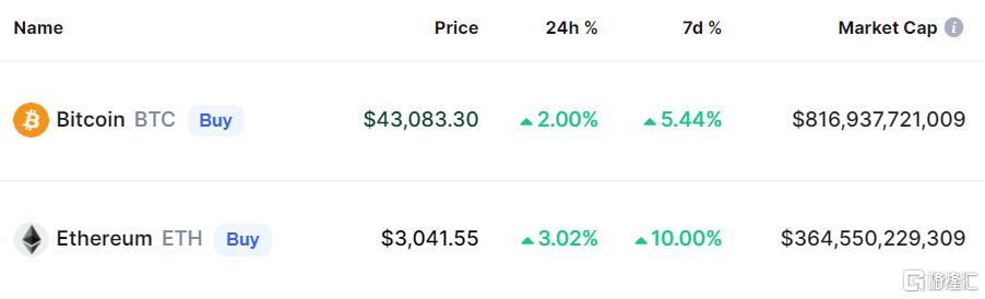 格隆汇3月24日丨区块链概念股走强,比特数字涨4.57%,Marathon Digital涨3.32%,嘉楠科技涨2.3%,Riot Blockchain涨3.36%,coinbase涨2.17%。比特币24小时内涨2%,报43083美元,以太坊24小时内涨3.02%,报3041.55美元。
