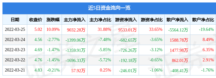 资金流向数据方面,当日主力资金净流入9032.28万元,游资资金净流入9533.01万元,散户资金净流出5564.12万元。近5日资金流向一览见下表: