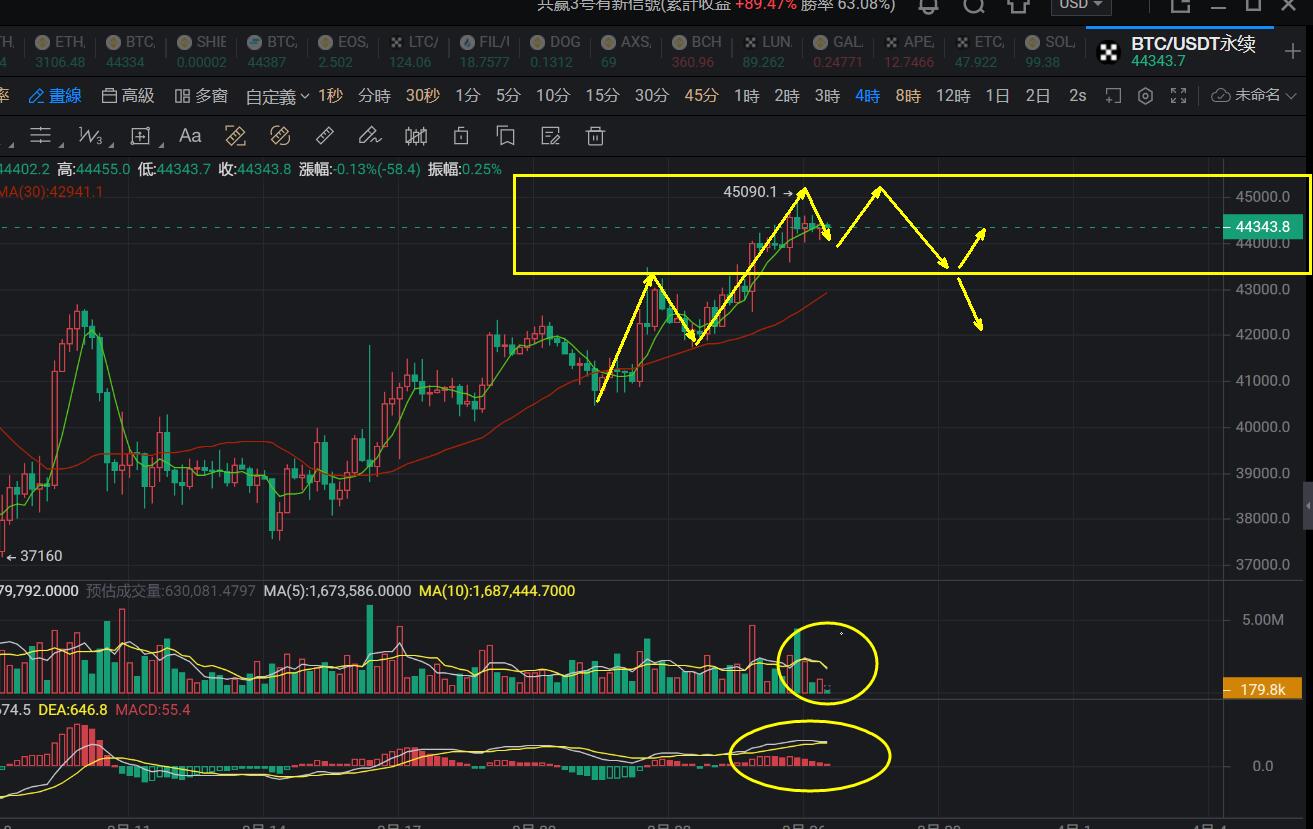 首先可以看出,经过昨天的拉升试探,比特币已经初步测试了上方高位压力的有效性,没有一举突破那就是市场暂时没有能力进一步打开上行空间,需要更多的多头力量入场打破平衡,因此视为高位震荡蓄力是比较合适的。短期内不能一举破位的情况下,若是有更多生力军多头入场的话,那么就能打破僵局。反之也成立,临近压力位附近,多头力量减弱,大部分资金做出止盈性撤出,势必也会影响多空力量的角力,多军撤退,空军加仓优势也会显现出来,那么伴随的就是大幅下跌回落,甚至是断崖式下跌。现在这个位置就是多头最后一次角力的平台,接下来支撑压力位一旦破位那么就是阶段性一方力量主导市场的走势,那么交易上面也比较好做布局,就看是行情是上破压力还是下破支撑就好。也就是说,今天重点关注一下43500-45500这个区间内行情往那边做出突破,四小时看行情有初步构成了反转信号,但近市场持续向上运行走势较强,昨天往上测试了一下上方的压力位有效性,经过了今天的调整之后,不排除继续往上尝试做出突破的可能性,那么操作上面也就很明显了,压力位还在,且初步有效,日内若是能够再次上探压力位不破的情况下,可以高位开始布局空单,再次尝试摸顶。而下方则关注43500一线支撑位置能否有效企稳,行下跌能到这个位置企稳的话,就还是高位震荡当中,可以以此支撑位置去开始布局多单,等行情再次去运行选择方向。思路,反弹45500-45000不破做空,止损400点,目标看下方43500附近,43500不破做多,止损400点,目标看45000一线。没有做出突破之前区间对待,等行情突破方向之后,接下来再顺势而为即可。