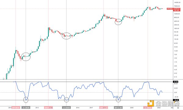 摘要:上方为BTC长期走势,下方为动量指数曲线,从图中可以看出,目前该指数自去年上半年BTC见一顶后便触及上方压制线从高位回落,到目前整体仍是震荡下滑的状态,即便去年11月BTC再创新高,该指数也未能突破上半年高点,结构上形成大级别背离,后面出现了本轮大调整。研究历史可以发现,动量指数一旦触及上方压制线,往往是一轮牛市的阶段顶点或者大顶,例如
