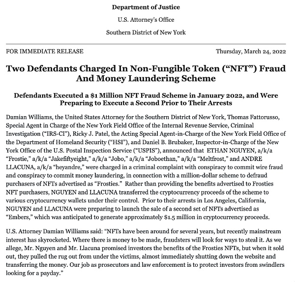 根据诉状描述,自2021年9月左右,被告人Nguyen和Llacuna开始启动FrostiesNFT欺诈项目。2021年12月,该项目团队在包括Twitter和Discord上为FrostiesNFT产品做宣传,目的是将用户引至“Frosties网站”。