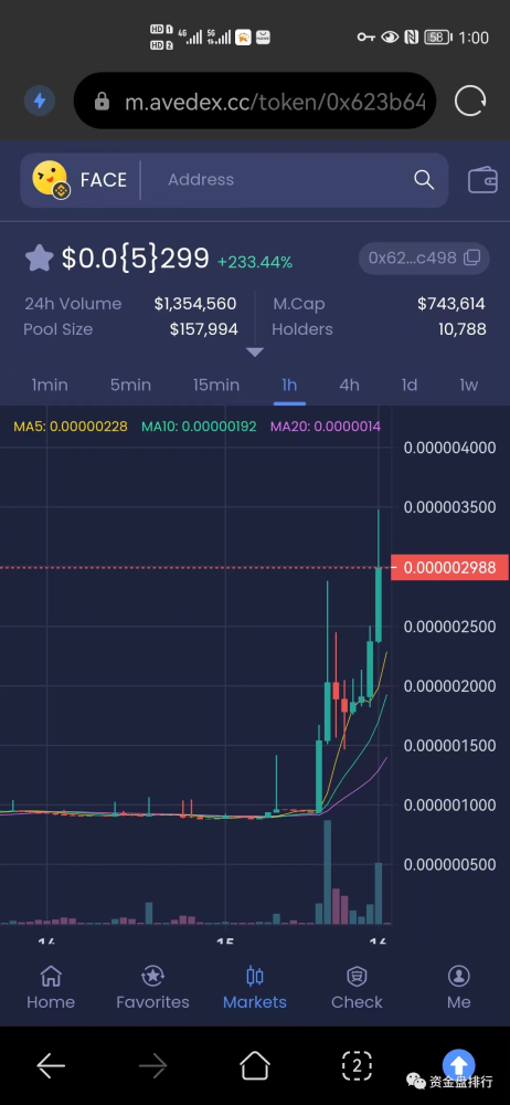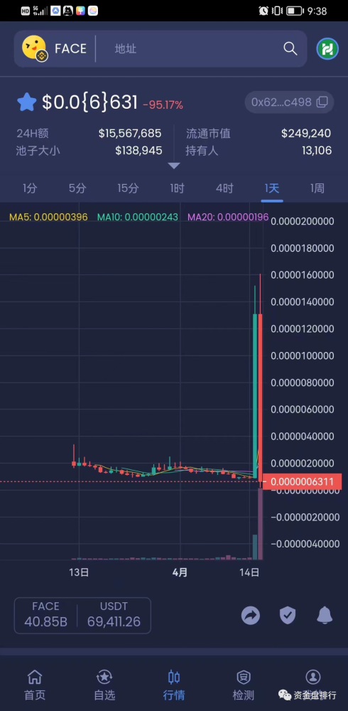 fomo的程度还是挺高,而且这个face真币是要18号在火币上线,然后假项目方在13号就开池子了,你还真别说,有火币上线加持,还真有信以为真的韭菜冲了起来,一天轻松10倍,持币地址达到1万多,池子流动性177万。