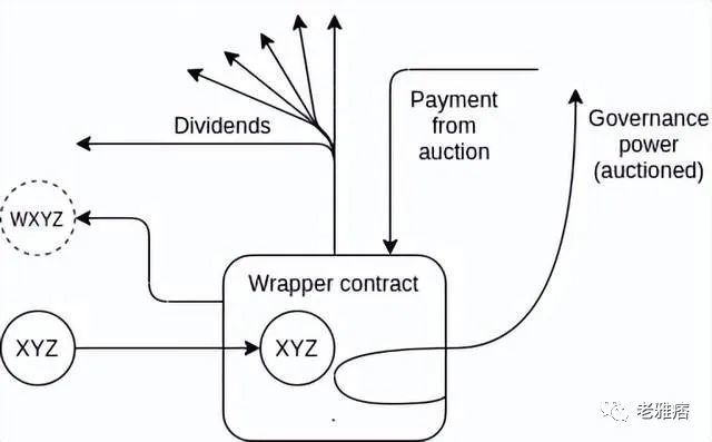但实际上,这两种权利很容易相互解绑. 想象一个具有以下规则的简单合约:如果您将 1 个 XYZ 存入合约,您将获得 1 个 WXYZ。WXYZ 可以随时转换回 XYZ,此外它还会产生红利。红利从哪里来?好吧,虽然 XYZ 代币在包装合约中,但合约能够在治理中随意使用它们(提出提案、对提案进行投票等)。包装合约每天简单地拍卖此权利,并将利润分配给原始存款人。