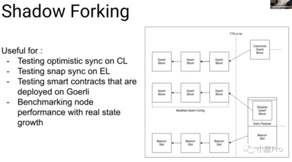影子分叉在概念上类似于 devnet,只是它复制不同网络(devnet 或 mainnet)的状态,而不是拥有自己的独立状态。例如,以太坊主网络的影子分叉仍然接收到主网的所有交易。这个分叉可以转换为权益证明,同时仍然拥有主网交易和其他历史/状态信息。在影子分叉上成功合并后,它会继续使用权益证明链,忽略使用主网上工作量证明添加的任何块。