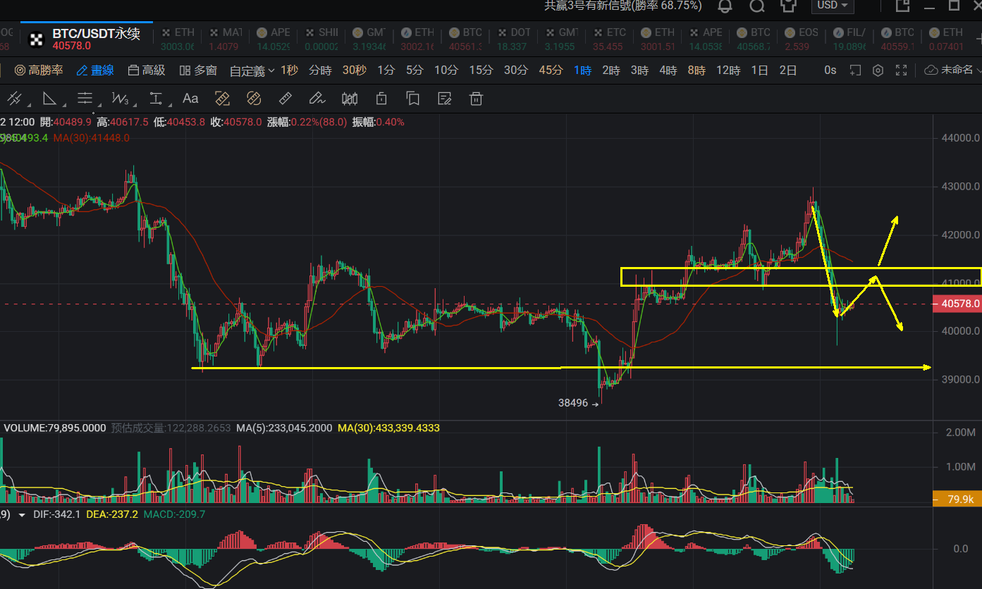 首先大饼前期打破的41500一线的高点支撑位置再次被下破,行情又重新回到了下方的箱体运行的区间,而且日线上面连着两个上影线较长的阴线已经走出了反转信号,小时线趋势明显走弱,短期内行情更倾向于空头,这种时候不管行情是否是诱空还是终极砸盘,该有的警惕必须要有,再重新去看待进场机会和压力位支撑位置去做安排。小时线上面来说,短期内下跌破位之后40900-41500形成了接下来的一个向上运行的压力位,昨天下跌这么迅速,行情走低之后反弹能否再次走强就看这个区间内行情能否做出突破,趋势已经偏空,若反弹再不破压力位区间,那么这个位置就是一个比较好的开空时机和点位,目标的话今天周五走出延续下跌的话,大概率就会去往39100一线的强支撑位置附近,甚至是破位创新低,别忘记今天是周五,可能黑色星期五出现也不稀奇。因此,今天的思路可以做出一些调整,行情反弹不破40900-41500区间开始做空,止损带到41800足够,目标看39100一线,破位持有。