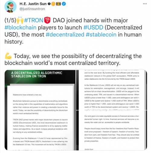 孙宇晨发起去中心化稳定币USDD,引领行业“脱虚向实”