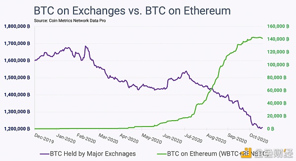 使用中心化交易所与锚定币之间的权衡是相似的。在这两种情况下,存管者不再拥有基础资产的保管权。虽然Ethereum上的去中心化交易所的效率远低于中心化的订单簿交易所,但前者可以获得大量新发行的资产。此外,比特币锚定币的持有者可以将其作为贷款的抵押品,并获得所持比特币的 "收益率"。因此,锚定币资产的附加效用很可能导致各大交易所持有的比特币减少。