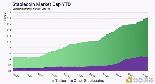 稳定币可能是造成这种减少的原因之一。作为背景,稳定币总市值年初至今增长了3倍,从1月份的58亿美元增长到截至11月的178亿美元之多。由于在中心化交易所有存款的最大好处之一是法币的存入提出,稳定币可能会争夺部分效用。我们在《稳定币的崛起》报告中探讨了一些问题,该报告对稳定币增长的驱动力进行了深入回顾。