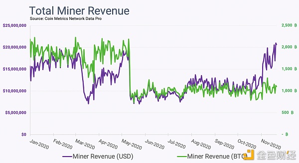另一个表明矿工们能够像往常一样出售他们的比特币的指标是他们发送的比特币的总价值。如果矿工们无法出售他们的比特币,那么他们账户的总流出量很可能会下降。然而,情况似乎并非如此。截至11月21日,已有809217个比特币离开矿工账户。按照这个速度,11月矿工发送的比特币总量将超过全年平均每月发送的1,052,589个比特币。