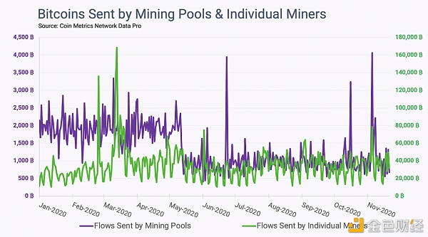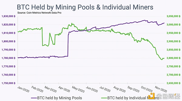 从总量上看,矿池运营商持有的比特币数量在2020年期间有所增加。值得注意的是,在减半之前的4月份出现了一个急剧的飙升,随后稳步增加。相反,个人矿工所持有的比特币在2020年有所减少,11月的增幅尤为明显。