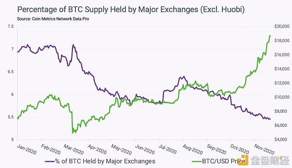 有趣的是,Huobi并不是唯一一家比特币存款减少的交易所。在2020年的过程中,即使我们将Huobi从列表移除,主要交易所持有的比特币供应总量的比例也在累计减少。我们注意到,我们支持的主要交易所(Bitfinex、BitMEX、Binance、Bitstamp、Bittrex、Gemini、Kraken和Poloniex)持有的比特币总量都在减少。
