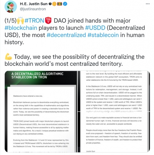孙宇晨发起去中心化稳定币USDD,引领区块链“脱虚向实”