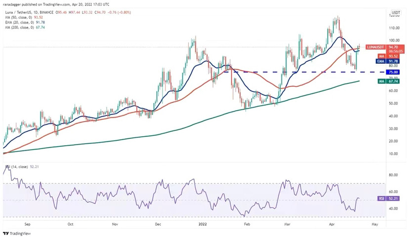 Terra 的LUNA代币从 75 美元的强劲支撑位反弹,并在 4 月 18 日达到 20 天均线(91 美元)。这表明市场情绪仍然积极,交易者正在逢低买入。