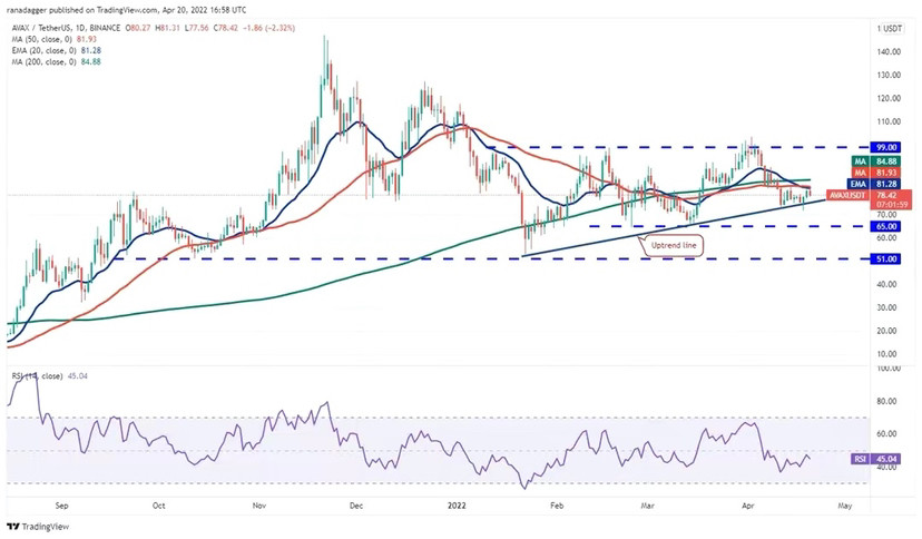 空头在移动平均线处设置了强阻力。如果价格继续走低,空头将再次尝试下沉并将 AVAX/USDT 货币对维持在上升趋势线下方。如果他们成功,跌幅可能会扩大到 65 美元。