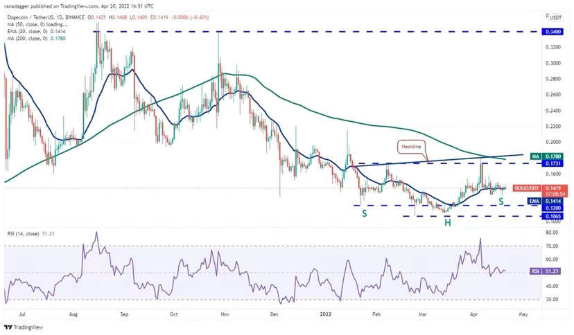 反弹在 4 月 19 日升至 20 日均线(0.14 美元)上方,但多头正努力维持较高水平。这表明空头正在反弹至直接阻力位 0.15 美元。