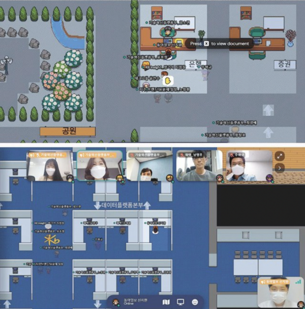 2021年6月,韩国国民银行在元宇宙平台Gather上创建了一个“虚拟城镇(virtual town)”,其中包括一家远程办公中心、一家金融商务中心和一个游戏场。在远程办公中心,员工能够在规定时间到虚拟会议室,通过视频进行工作汇报和工作沟通。“多亏了元宇宙,我感觉我的工作效率提高了很多,我可以在家中与团队成员积极交流。”该银行经理表示。