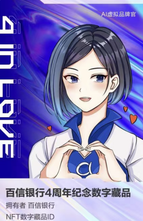 2021年11月18日,百信银行发行了“4 in love”四周年纪念数字藏品,并同步推出AI 虚拟品牌官的二次元形象。该藏品在百度超级链上发行,具有唯一性和不可篡改性。这是银行业首个数字藏品,也是百信银行迎接元宇宙的一次尝试。