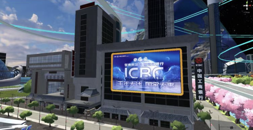 2021年12月,工商银行河北雄安分行作为首批金融机构宣布入驻希壤。希壤是由百度打造的,一个平行于物理世界的沉浸式虚拟空间。在希壤Creator Tower的北侧,工商银行河北雄安分行大楼庄严地伫立着。