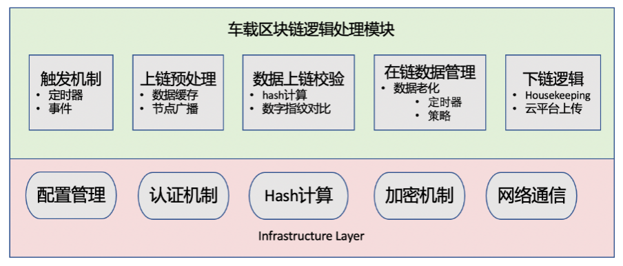 基于区块链技术的服务框架在车端的应用需要包含区块链的关键元素,但是需要充分考虑到车内计算资源,对其做裁剪和定制。