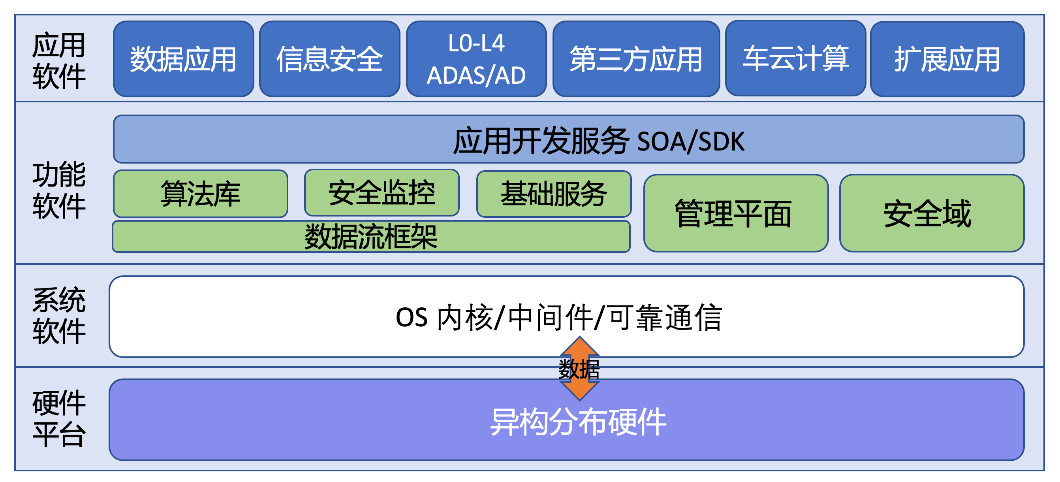 其中,硬件平台包括各种异构硬件:传感器、执行器、车辆平台、AI芯片、HSM、可信计算环境等;系统软件包括操作系统内核、中间件以及相关的内核服务;功能软件层是提供智能驾驶服务的核心功能,包括数据流、AI算法库、数据服务、车云计算等基础服务;应用软件是基于操作系统提供的SOA或SDK接口进行不同的应用开发,典型的应用软件例如L0-L4 ADAS、车云计算、第三方应用等。