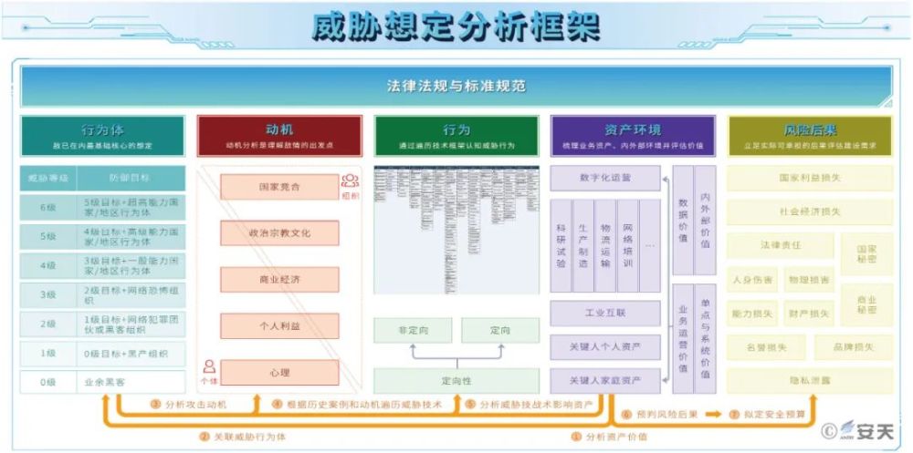 2017年6月,安天提出了“有效敌情想定是网络安全工作的前提”,将“敌情想定”这一军事术语引入了网络安全领域。在后续的实践中,安天以此为基础发展出“威胁想定分析框架”,作为重要信息系统和关键信息基础设施防护规划的基本方法。分析框架从“威胁行为体”、“动机”、“行为”、“资产环境”和“后果”等方面,围绕价值资产,分析关联的威胁行为体及其动机,根据历史案例和动机遍历威胁技术,分析威胁技战术对资产环境的影响以及风险后果,以此作为规划安全能力建设要点的需求输入。