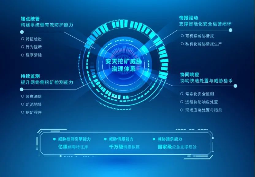 通过持续监控与协同响应,联动包括端点侧、边界侧、应用侧、流量侧等场景对“挖矿”活动进行全面响应处置,基于情报生产、消费的闭环,赋能给各场景防御系统,有效实现对“挖矿”行为的实时监测告警、响应处置。