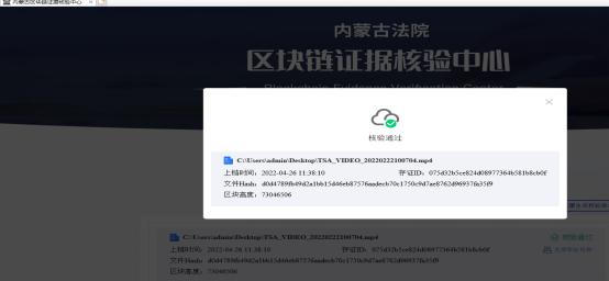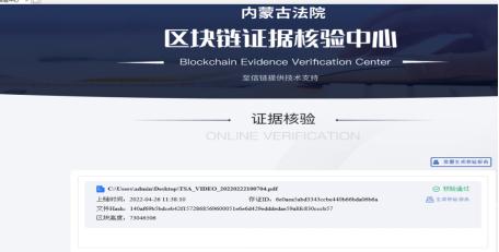 近年来,乌海市中院积极探索创新科技与司法审判工作的深度融合,推进“智慧审判”、“智慧执行”、“智慧服务”、“智慧管理”。乌海市中院积极响应自治区高院《关于推广使用区块链技术应用司法实践的通知》工作部署,成为全区法院“司法区块链技术”重点试点法院。2022年4月,乌海中院网上立案平台收到一起原告内蒙古某集团股份有限公司诉被告海南区某超市、包头某乳业公司、宁夏某乳业公司、宁夏伊某某乳业公司及内蒙古某乳业集团公司侵犯商标权纠纷案件,诉讼请求为停止侵权、销毁侵权产品,并支付经济损失及合理开支50万元。法院工作人员注意到原告所提供的主要证据材料类型是视听资料,且本案的诉讼当事人分散在各地,为应对可能因疫情原因当事人不能到场参加诉讼,人民法院需进行在线办案的情况,工作人员即刻联系原告委托诉讼代理人,引导其运用区块链技术存证,将提供的证据材料上传至“至信链”,方便当事人进行诉前调解或在线参与诉讼的证据材料认证。经过工作人员利用内蒙古法院区块链证据核验系统对原告提供的视听资料进行核验,原告所上传的视频资料证据哈希值与人民法院通过区块链证据核验系统核验的哈希值一致。