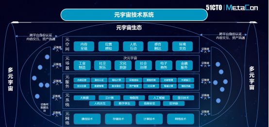 技术系统可以分成五层:元网络,主要包含通讯、存储、计算和网络等基础设施;元系统,是区块链等新一代信息技术的集成应用;元服务,包括内容创建、3D渲染、身份认证、隐私保护、资产确权等服务;元场景,可以应用在工业、制造、社会、娱乐、文化、旅游、社会治理等方向;元空间,指元宇宙的虚拟空间与外部物理空间交互的过程,包括位置感知、人机互动、感官触达、环境支持等技术。