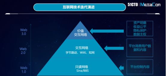 互联网技术的迭代演进,也为元宇宙提供了很好的支持。从只读的互联网络Web1.0到交互的互联网络Web2.0,也就是当前的状态,比如Wiki、知网等平台,在这些平台上消费用户的数据和内容,用户是无法基于其数据和内容拿到相应权益的。所以产业界提出了Web3.0的概念,价值交互互联网。在价值交互互联网当中可以形成资产明确、收益公平的产业生态,同时还能够保证用户的隐私和数据主权。
