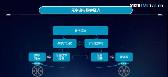 同时,元宇宙是一个大的消费场景,它通过沉浸式的体验让更多用户进入到场景当中,从而拉动信息消费,在以区块链为核心的新一代信息技术集成构成的Web3.0的技术体系的支撑下,来推动产业数字化。