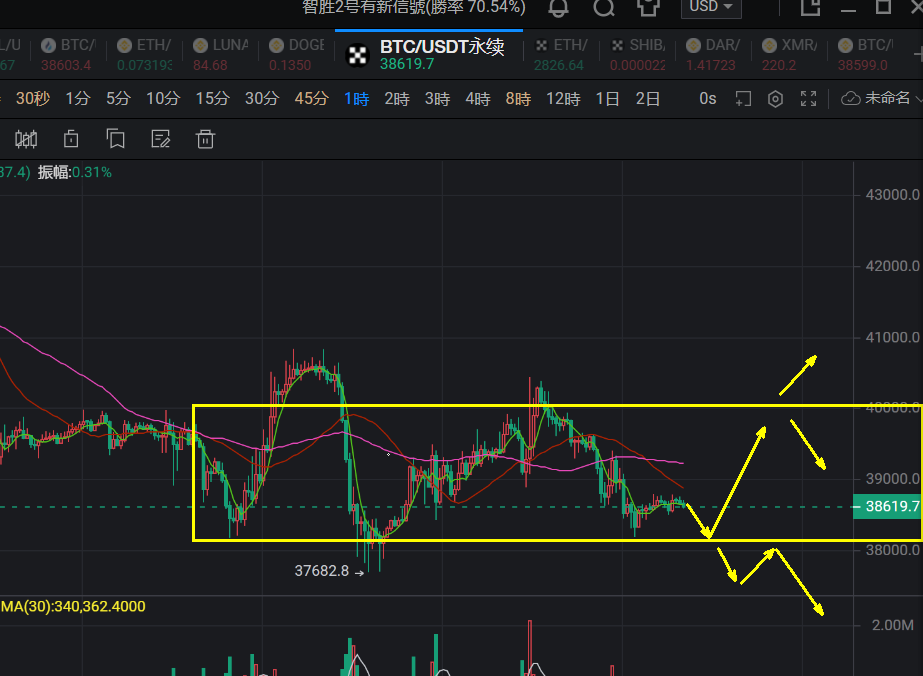 比特币目前来看日线再次收阴但是没能跌破38000关口,下方的37500一线强支撑位置还可视为有效,而不断的阴阳轮转的洗盘也有可能是筑底的过程,没有进一步下跌破位之前行情都还是有触底走高的可能的,所以日内需要关注的重点就是下方看37500一线支撑的有效性,下方不能跌破37500一线的话,不排除再次上涨走高的可能,而上方的一个重要的压力位则是40000整数关口附近,此次低位来回盘整也一直维持在这个区间内在运行,不论日线大跌或是大涨,都需要破位才会有进一步明确的方向走出,大概率现阶段就是一个底部成型的过程,主力不断砸盘吸筹,准备走出一轮新的上升行情,反弹反转暂时先不说,阶段性的上涨空间打开的话,4000-5000点的空间会有的,小级别的小时线走势在不断反弹上涨运行当中,暂时就以反弹的思路去对待,行情或许先上涨看看能否突破40000整数关口压力。