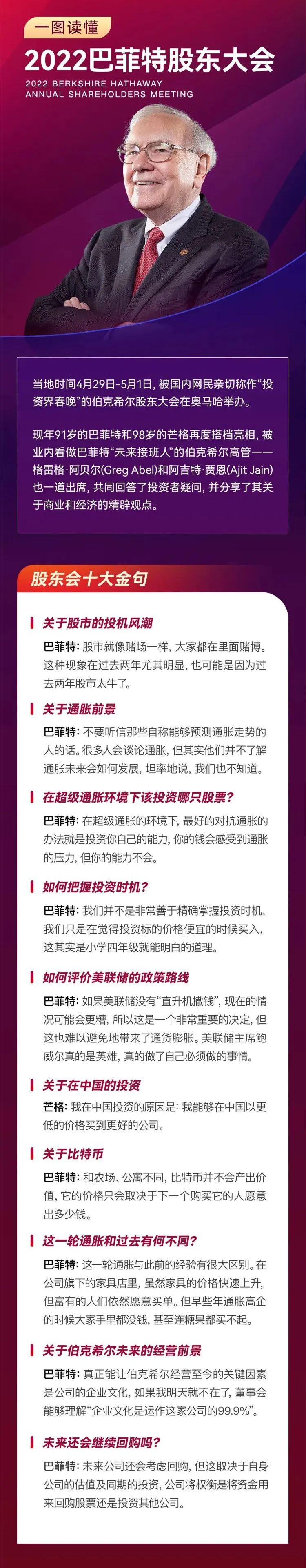 值得一提的是,今年股东大会上,巴菲特仍未正式宣布接班人人选。不过,在2021年股东大会上,巴菲特曾说:“董事会一致认为,如果今天我出了什么事,那么明天早上接替我的将是格雷格。”