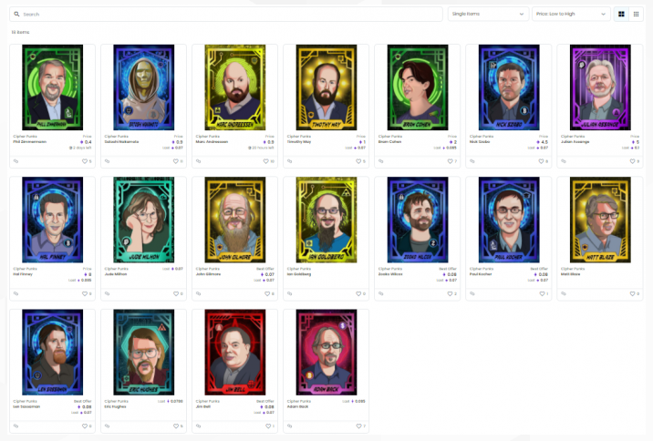 图源:Twitter不光是Jillian York,这套由一名叫“It'sBlockchain”的组织发布了名为“Cipher Punks”的NFT资源包,涵盖了46位不同人物的肖像,每个肖像令牌都有10个副本。其中的槽点不止是未经允许发行,还包括拼错了多位人物的名字。