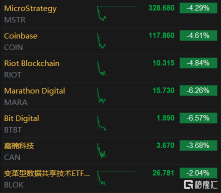 格隆汇5月4日丨美股区块链概念股走低,Marathon Digital、Bit Digital跌超6%,MicroStrategy、Coinbase、Riot Blockchain跌超4%,嘉楠科技跌3.68%,区块链ETF BLOK跌2.04%。
