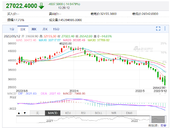 在稳定币TerraUSD崩溃后,引发了数字资产市场上许多最受欢迎的代币的蜂拥撤离,与加密货币相关的亚洲股票下跌。雄岸科技跌超5%,火币科技跌3.46%,欧科云链跌2.38%。比特币一周内两次失守3万美元心理关口,12日比特币一度跌超6%,跌破27000美元/枚。较去年11月的历史高位腰斩暴跌逾55%。伴随本应锚定1美元的算法稳定币UST价格低至26美分,市场担心其坐拥35亿美元比特币来“撑市”的背后组织,可能要从“最大买家”转为比特币最大卖家。