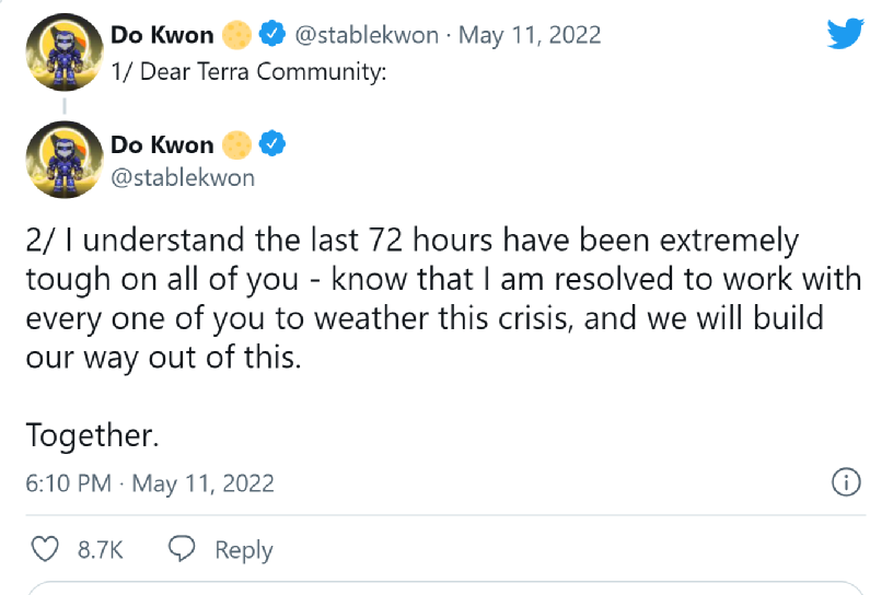 面对币值大幅缩水,Terra创始人Kwon出来喊话:“过去72小时对每个人都非常艰难,我决心与每个人一起度过这场危机,寻求自救方法。”不过币圈业内警告:UST如果没有救回来,不要轻易尝试抄底LUNA。
