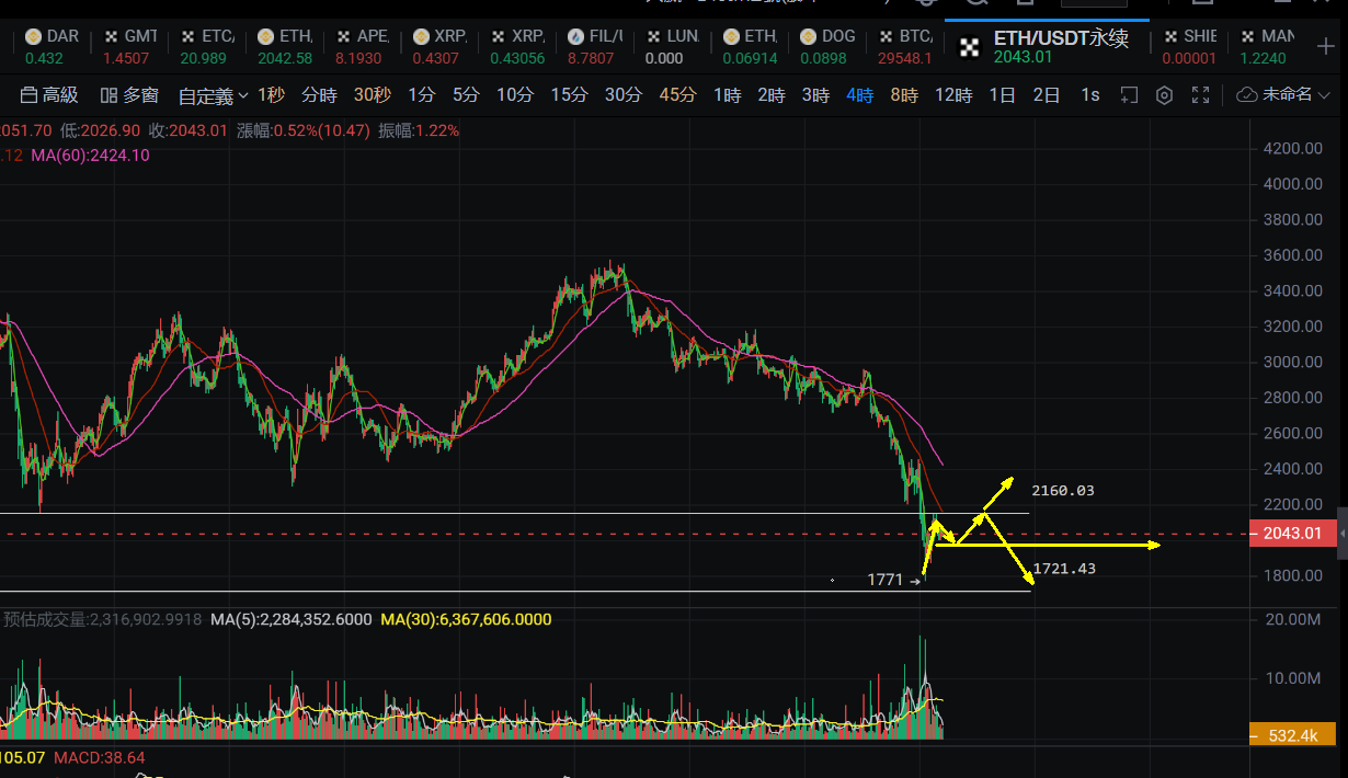 以太坊的表现大方向上面是同步的,但下方的强支撑位置则是在1700附近,前期快速下跌加速最终没能跌破下方的前低点强支撑位置,所以相对来说以太表现的更稳,距离下方的强支撑位置更远,昨天最终回落下去的力度也没有太多,盘中就回落下去到2040-2000整数关口区间止步,那么今天的思路就较为明显了,以昨天回落下去的低点2000整数关口支撑去做短线多单套利,继续看反弹走高。2000-2040区间作为多单介入的点位都较为合适,把止损带到1960附近足够,目标的话可以重点关注2170一线压力位的有效性,破位切站稳的话继续看反弹能不能去往3315附近。