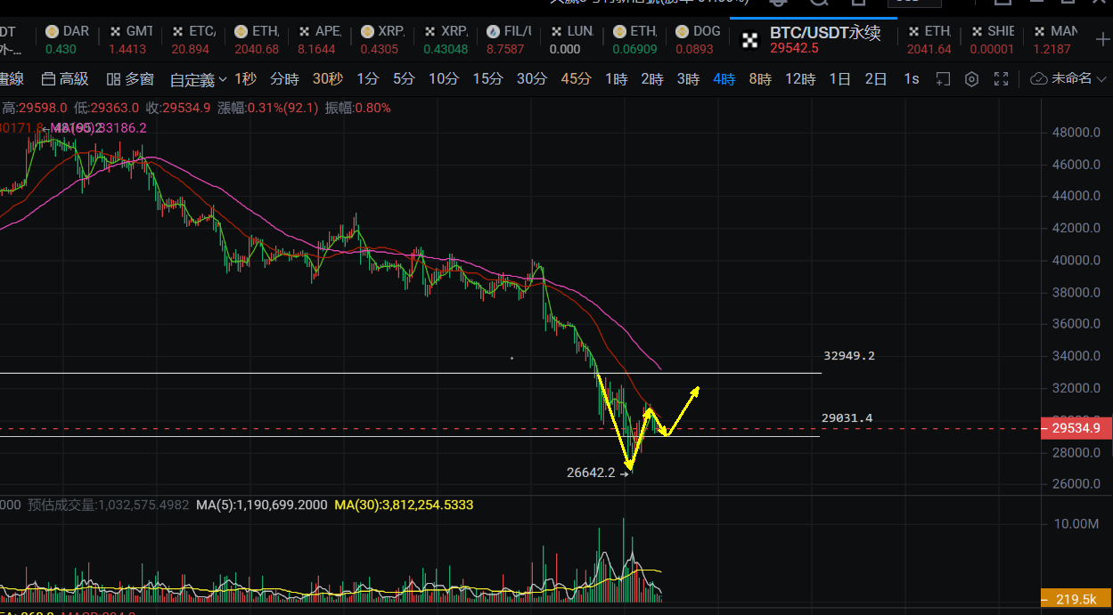 就比特币来说,向下刺破前期低点支撑之后的深V反转之后,短期内进一步上涨向上破位的概率较大,昨天老刘文章里面是这么强调,接下来看行情回落下去能否在29000附近企稳是关键,那么经过了昨晚的回落确认之后,确实下方29000一线支撑位置有效,那么今天的整体思路也是延续昨天的思路对待,以下方29000一线支撑位置有效的情况下可以接着看行情走进一步反弹,考虑周末的原因,震荡上行对待就好,毕竟行情跟着我们预期的在走,就没必要去频繁的做出改变,不走预期需要调整,走预期那么就安心跟随就好,目前小级别来看,下方的29000一线的强支撑还是有效的,操作上面想做短线套利的话就利用大饼向29000回落的机会去分批做多,止损的话往下方400点空间,毕竟若是行情再次跌破29000的话,考虑此次深V反弹的走势就是前期下跌太狠的一个报复性反抽,当插曲对待。目标可以先看3000整数关口,能有效破位的话可能就是去测试33000压力位的有效性了,周末交易量清淡的情况下走出这么大上涨的可能性不大,但是也不排除市场闹妖的可能,有备无患总不是坏事。